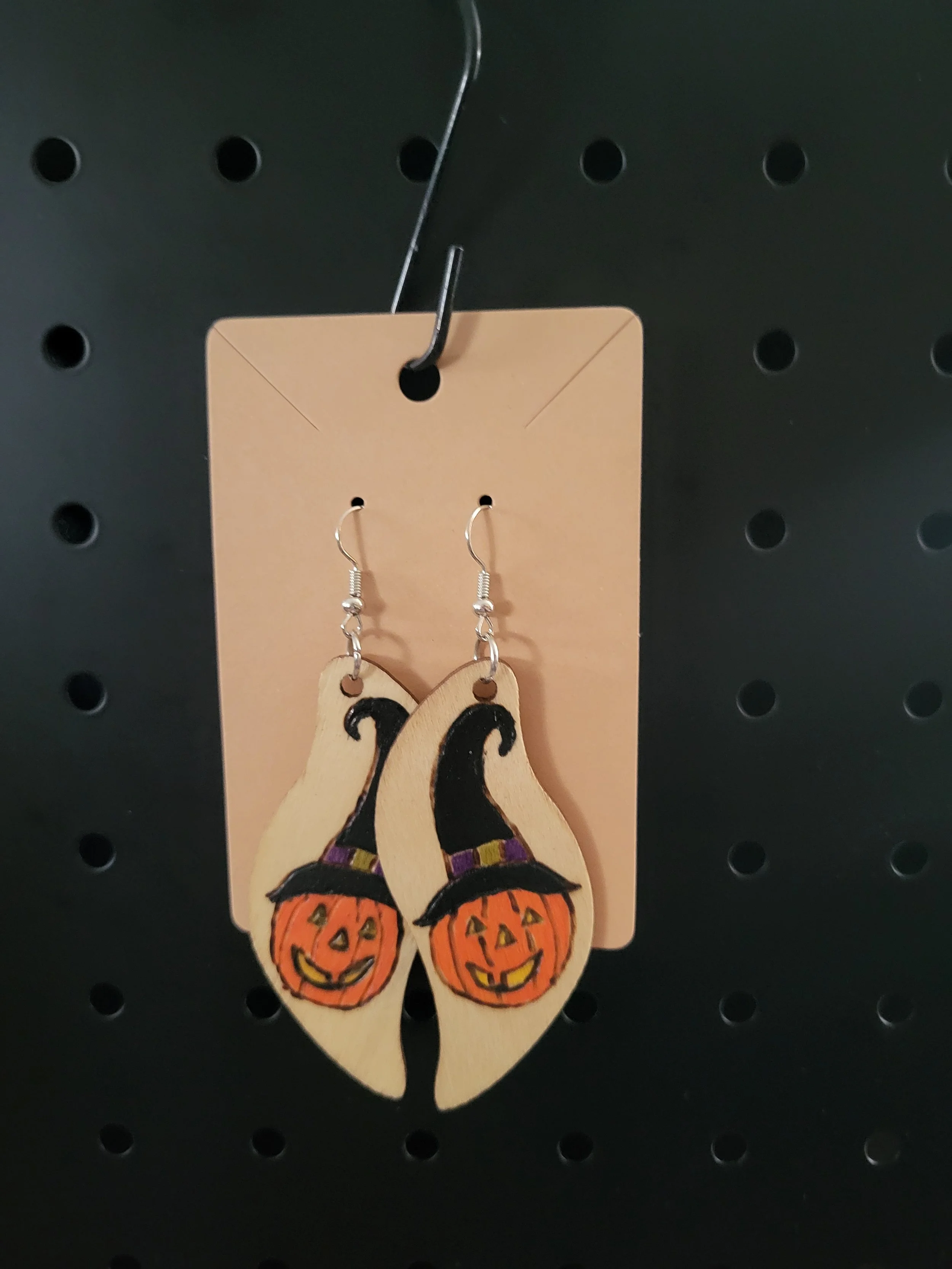 Image 1 of 1 pumpkin in witch hat earrings $10.00 3 inch natural wood earrings. Hand drawn, wood burned and painted. Add To Cart Added! 3 inch natural wood earrings. Hand drawn, wood burned and painted.