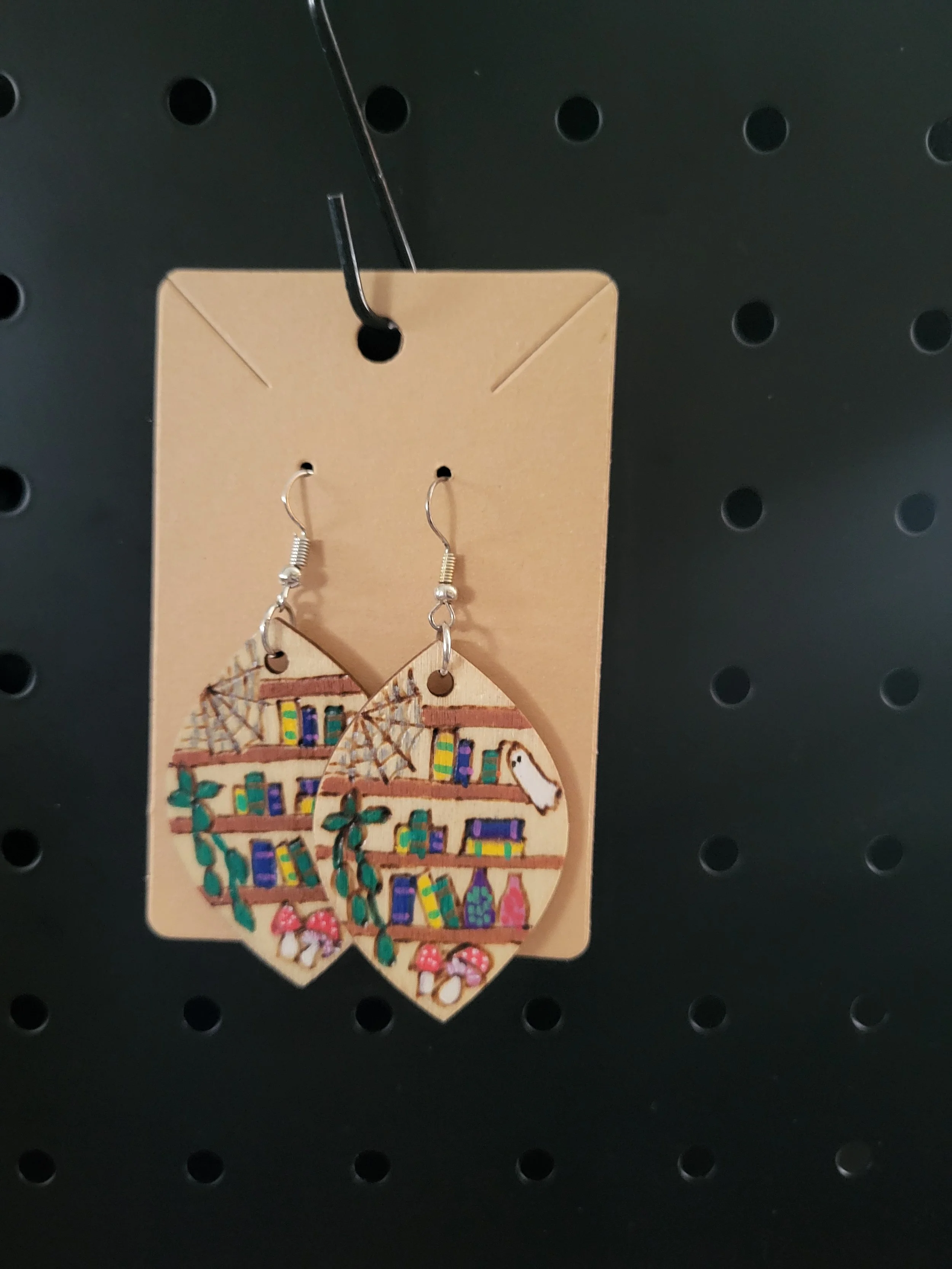 Image 1 of 1 #505 haunted library earrings $10.00 2 inch wood teardrop shape earrings. Hand drawn, wood burned and painted. Add To Cart Added! 2 inch wood teardrop shape earrings. Hand drawn, wood burned and painted.